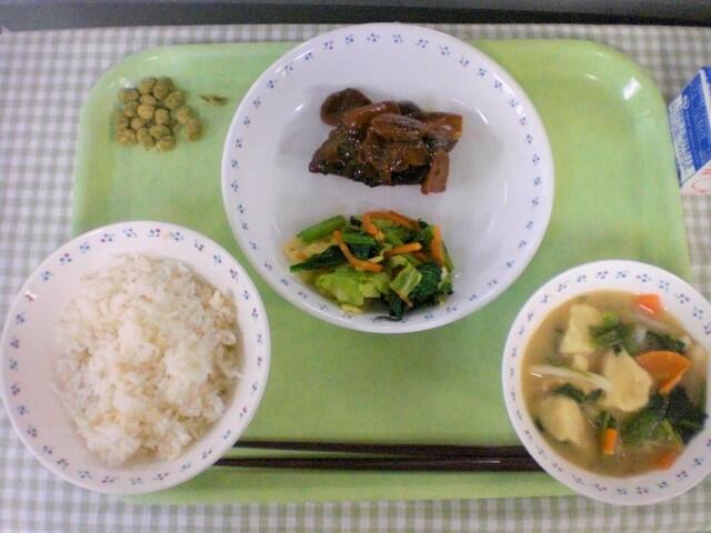 今日の給食は、和食です。今日の汁物はすいとんです。すいとんは室町時代からあったとされ、江戸時代にはすいとん専門店があったほどの人気料理だったそうです。今日は、小麦粉、白玉粉を合わせ、よく練って、調理員さんが1つ1つちぎってくれて作りました。すいとん以外にも具だくさんで、栄養たっぷりです。