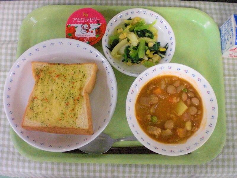 今日の献立は、洋食です。主食はカラフルガーリックトーストです。普通のガーリックトーストは、シンプルにマーガリンに塩とガーリックを練り込んで塗って焼き上げますが、カラフルガーリックトーストは、そこにパセリと赤パプリカを一緒に合わせることで見た目も彩りよく仕上げています。ガーリックがきいていて、食欲を誘う美味しいトーストなので、ぜひしっかり食べてもらえたらと思います。