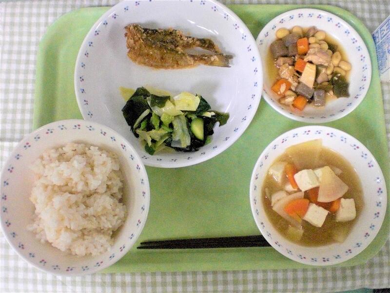 今日の献立は、和食です。主菜ははたはたです。はたはたには、体をつくるたんぱく質、記憶力アップのDHAやカルシウムの吸収を助けるビタミンDなどの栄養が含まれています。調理員さんが、うまくサクッと揚げてくれているので、骨ごとまるっと食べられます。ぜひしっかり食べてもらえたらと思います。