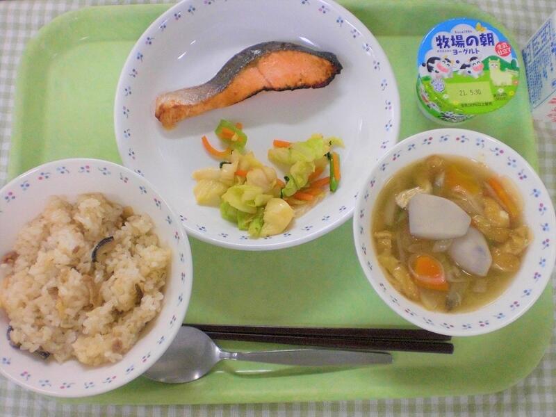 今日の献立は和食です。主食は、たけのこと豚肉のおこわです。たけのこの旬は3月から5月頃までです。そのため、フレッシュの新鮮なたけのこを使うのは今日でラストとなります。今日のおこわは、そのフレッシュなたけのこ6kgに加えて、豚バラ肉、しいたけを使ったシンプルで美味しいおこわとなっています。旬なたけのこを給食で食べられるのは最後なので、ぜひもりもり食べてもらえたらと思います。