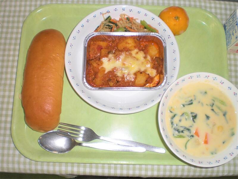 今日の給食は洋食です。主菜は、ポテトミートグラタンです。じゃがいも約42キロ、他にも豚肉、たまねぎ、ピーマン、マッシュルーム、大豆など合計すると約90キロ近い、たくさんの具材をつかって作っています。チーズもたっぷりかけて、焼き上げています。ぜひしっかり食べてもらえたらと思います。