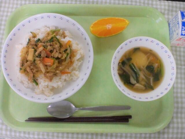 新年度1食目は韓国料理です。主食は、プルコギ丼です。プルコギは、牛肉を甘いたれに漬け込み、下味をつけてから焼く焼肉のことです。今日のプルコギ丼は、豚バラ肉をたっぷり使い、さらに、にんじん、たまねぎ、にら、えりんぎなど野菜やきのこもしっかり使って作りました。たっぷりの具とたっぷりのご飯をよそって、もりもり食べてもらえたらと思います。