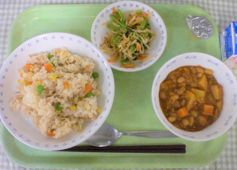 今日の献立は、洋食です。主食はツナライスです。今日のツナフレークは、まぐろのものなので、たんぱく質はもちろん、記憶力アップなどの効果のあるDHAや血液サラサラなどのコクかのあるEPAが含まれています。魚が苦手な人でもツナフレークになっていることで、くさみもほぼなく、お肉のように食べやすいです。また、他にも玉ねぎ、にんじん、コーン、グリンピースと具がしっかり入っており、彩りよく仕上げました。