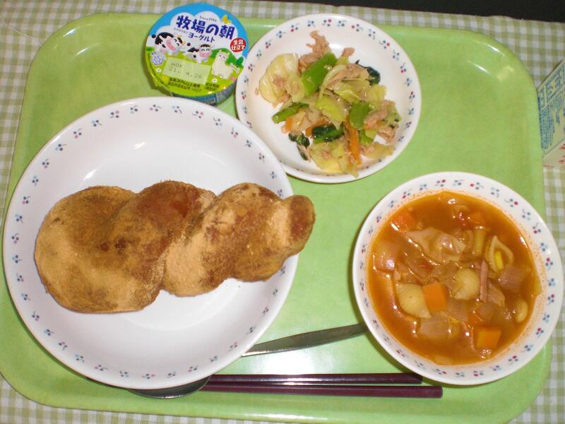 今日の献立は、洋食です。主食は、昨年度のリクエスト給食でも1位だった大人気の揚げパンです。三中には、色々な味つけがありますが、今日は定番のきなこ揚げパンです。調理員さんがパンを絶妙な時間でサッと揚げて、1つ1つ丁寧に粉づけして仕上げた揚げパンです。今日も美味しくできたので、ぜひ残さず食べてもらえたらと思います!