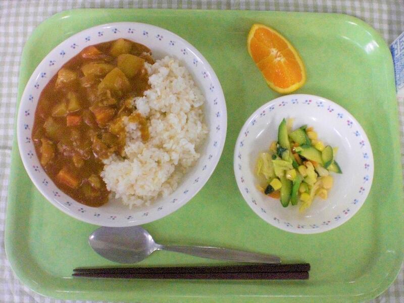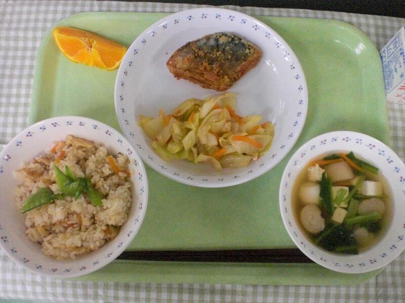 今日の献立は、和食です。主食は、春の香り御飯です。何が春なのか、というと、ずばり旬な「たけのこ」を使っているからです。今日は、鹿児島県で収穫されたフレッシュなたけのこを使っています。今日はそんなたけのこをたっぷり10キロと、にんじん、しめじ、油揚げを加え、春の香り御飯を作りました。ぜひもりもり食べてもらえらたらと思います。