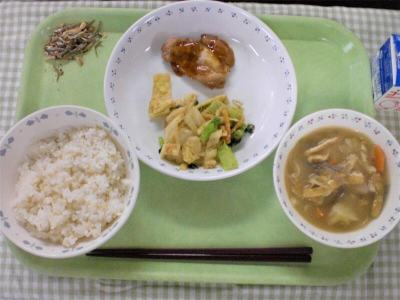 鶏肉は体をつくるたんぱく質が豊富で、成長期の中学生にとって大切な栄養素の1つです。今日の鶏肉のジンジャー焼きもお肉屋さんが持ってきてくれたお肉を美味しく仕上げたので、ぜひ残さず食べてもらえたらと思います。