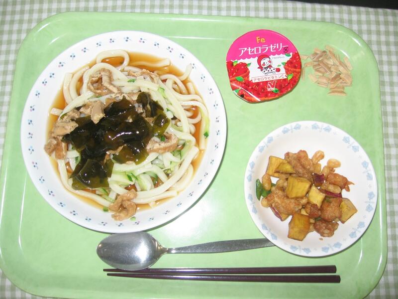 今日の献立は、和食です。主食は冷やしきつねうどんです。うどんは水で冷やし、さらに氷を加えてひえひえのうどんにしました。あまじょっぱく煮たお揚げもうどんにピッタリで、うどんがすすみます。ツルツルと食べやすく、また、うどんは消化にいいので、疲れている体でも負担が少なく、エネルギーになりやすいです。暑さで食欲が落ち気味かもしれませんが、体育祭練習を頑張るためには、やっぱりごはん、パン、麺などの主食を食べてエネルギーをとることが重要です。