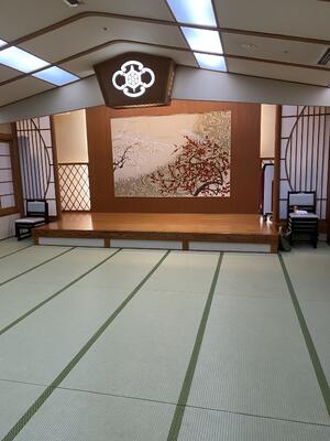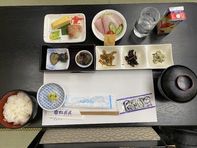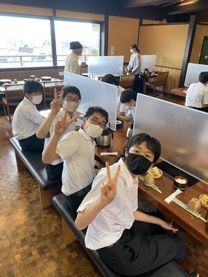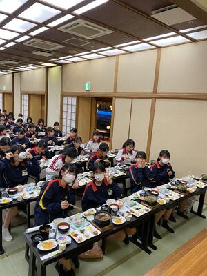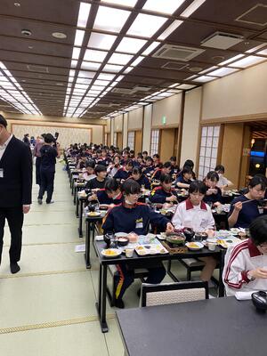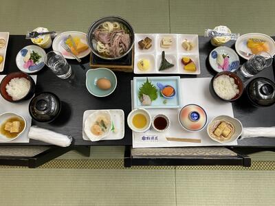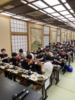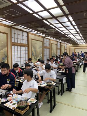 能楽体験を終え、宿舎に戻ると最後の夕食です。今日のメインは「すき焼き」です。食事美化部会の代表のいただきますの挨拶の前に、全員が水の入ったコップを持ち、「最高の感謝を込めて乾杯」と発声があり、宿のみなさんからも拍手を頂きました。