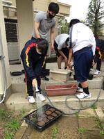 ですが、生徒達はせっせとポリポットに土を入れて卒業式の準備に精を