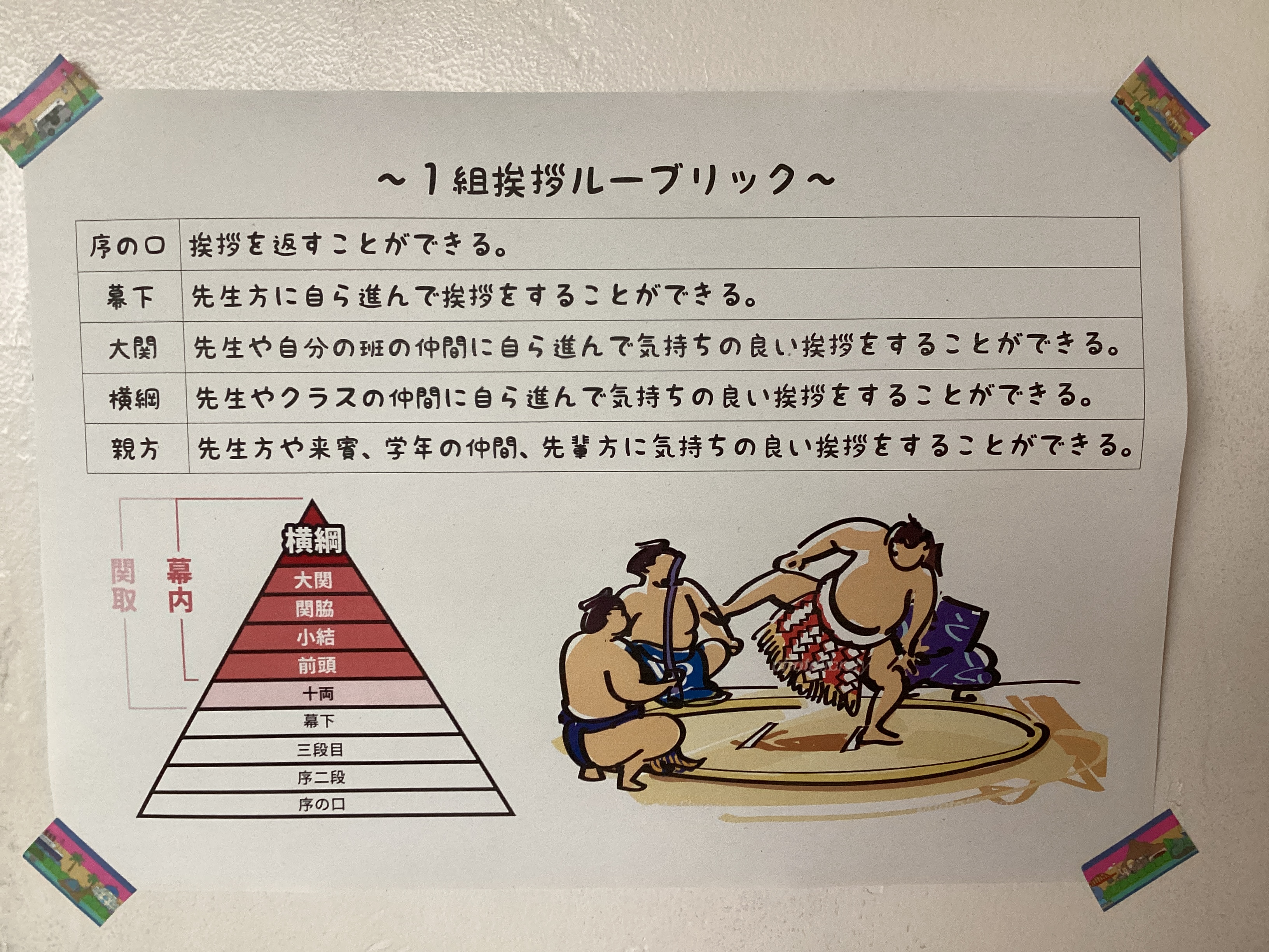 1年1組の教室の入口にも「1組挨拶ルーブリック」という紙が貼られており、