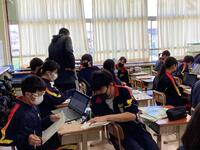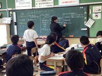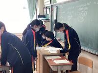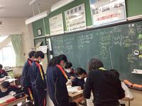 多項式の問題を解く2年生では、生徒達が教室の前に座り丸付けを