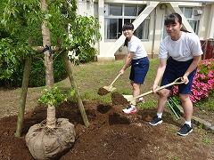 生徒会長の小林さんと副会長の鈴木さんが、生徒会を代表して植樹を行いました。