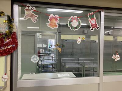 <今日の給食写真↓> <給食室もクリスマスになっています↓>