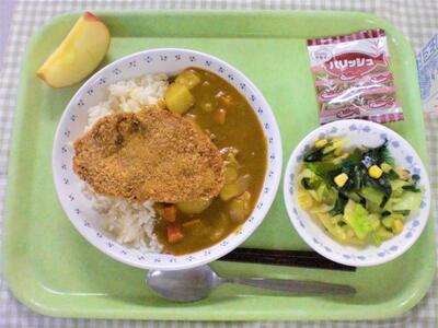 今日の献立は、洋食です。主食は、ポークカレーライスです。今日は、ポークということで、ゴロゴロした角切りの豚肉を、たっぷり約18キロ使ったカレーライスです。大きめのお肉なので、そのまま炒めて使うのではなく、まずお肉とスパイスだけで、ほろほろになるまでよく煮込み、それをさらにカレーに加えて作っています。また、煮込んだ肉汁も、だしと合わせてカレーに使っているので、味に深みがでています。今日のカレーも、調理員さんが10時半からずっとコトコト煮込んで、丁寧に作ってくれたカレーなので、ぜひもりもり食べてもらえたらと思います。