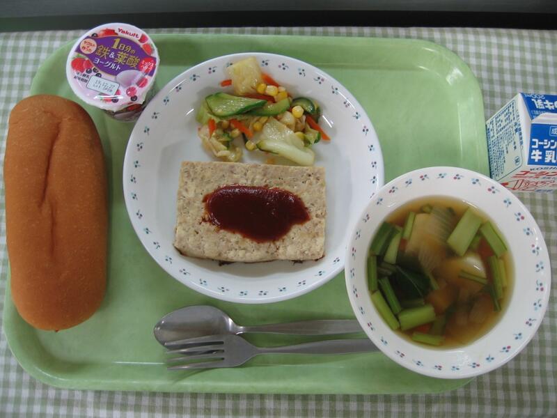 今日の給食は、洋食です。主菜はミートローフです。ハンバーグと似ていますが、ナツメグなど香辛料がきいており、形も四角形になっています。アメリカでは家庭料理となっており、日本でもクリスマスなんかによくだされています。
