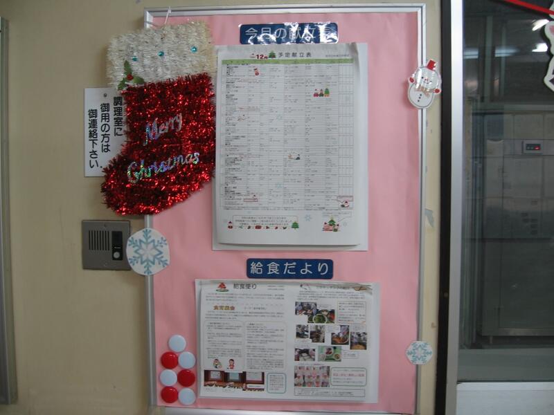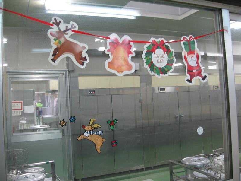 12月に入りました。早いもので、いよいよ今年もあと一か月、給食も14食で終わります。とても寒い給食室ですが、毎日美味しくなるように、一生懸命作るので、もりもり食べてくれることを願っています…!また、給食室も12月ということで、クリスマスになっています。