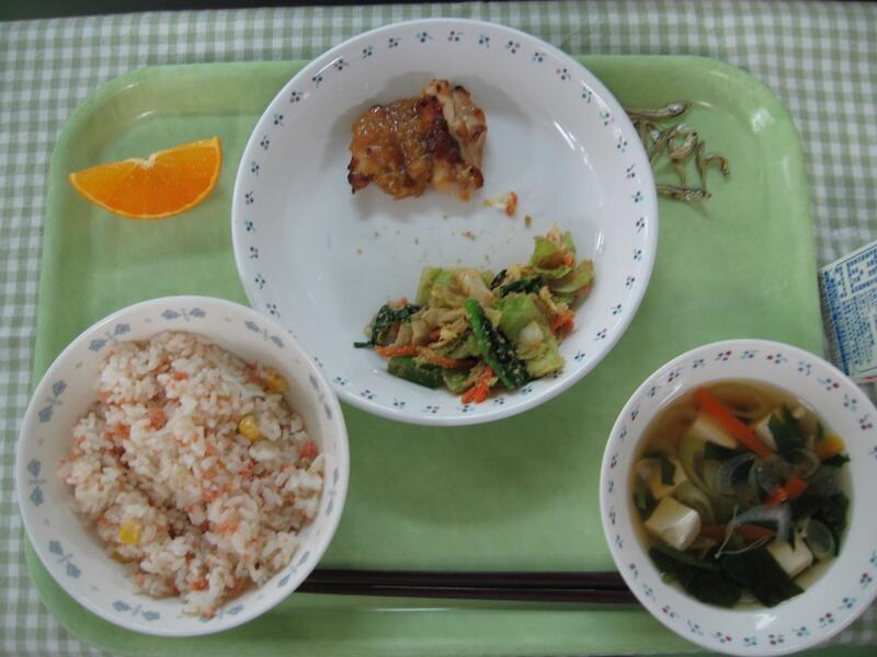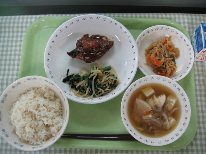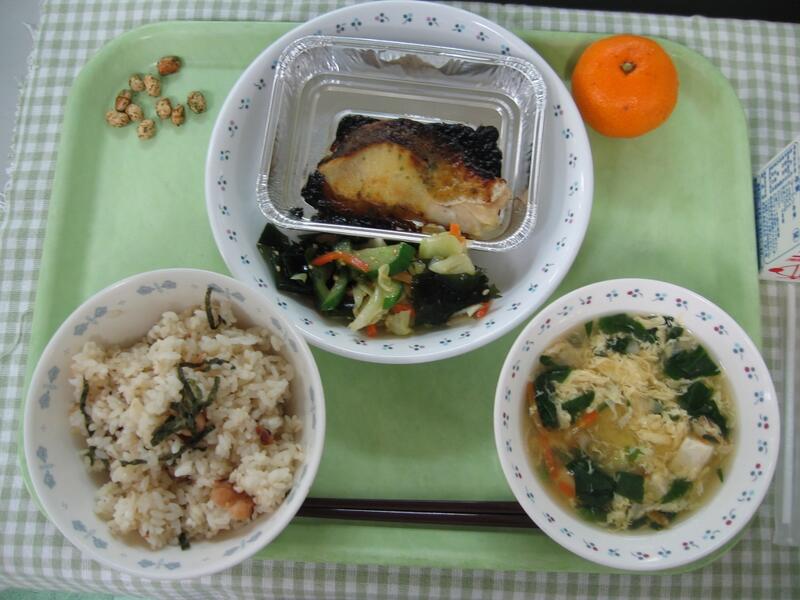 今日の給食は、和食です。主食はたこ飯です。その名の通り、たこをご飯に混ぜ合わせて、のりをかけたご飯です。しょうがを使って調理しているため、たこのくさみはほとんどありません。そして、主菜はメルルーサの味噌マヨ焼きです。淡白な味のメルルーサですが、味噌マヨをかけることで、味がしっかりし、美味しく焼きあがりました。魚のまわりの味噌マヨが焦げやすかったのですが、魚は焦げずにしっとりふっくら焼きあがってよかったです。子供たちも魚ですが、しっかり食べてくれていました。