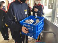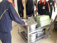 給食終了のチャイムが鳴ると、生徒は素早く片付けに取り掛かります。各クラスの給食当番が配膳用のワゴンをワゴンホールに運びます。
