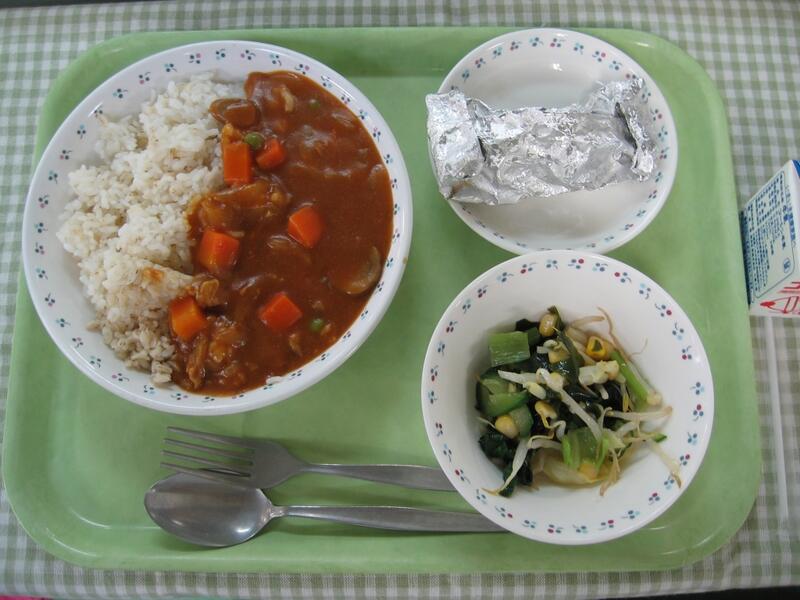 今日の献立は、洋食です。デザートは焼きりんごです。今日は贅沢に、りんご四分の一が一人分となっています。合計で110個ものりんごを調理員さんが頑張ってカットし、砂糖、シナモン、バター、レーズンをかけて、1つ1つアルミホイルで包みました。生でも美味しいりんごですが、バターとシナモンの風味がある焼きりんごもまた美味しいので、ぜひ残さず食べてくれたらと思います。