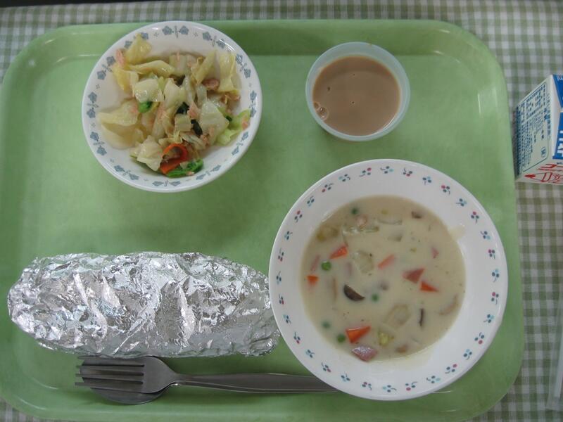 汁物はさつまいものクリームシチューです。さつまいもは今が旬のものです。ビタミンCは芋類のトップであり、免疫力アップなどの効果があります。また、さつまいも以外にも、同じく旬なしめじが入っています。しめじにもβグルカンという免疫力アップの働きのある栄養が含まれています。シチューを食べて温まるとともに、しっかり食べて風邪予防をしてもらえたらと思います。