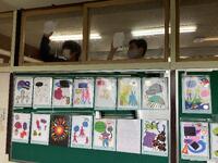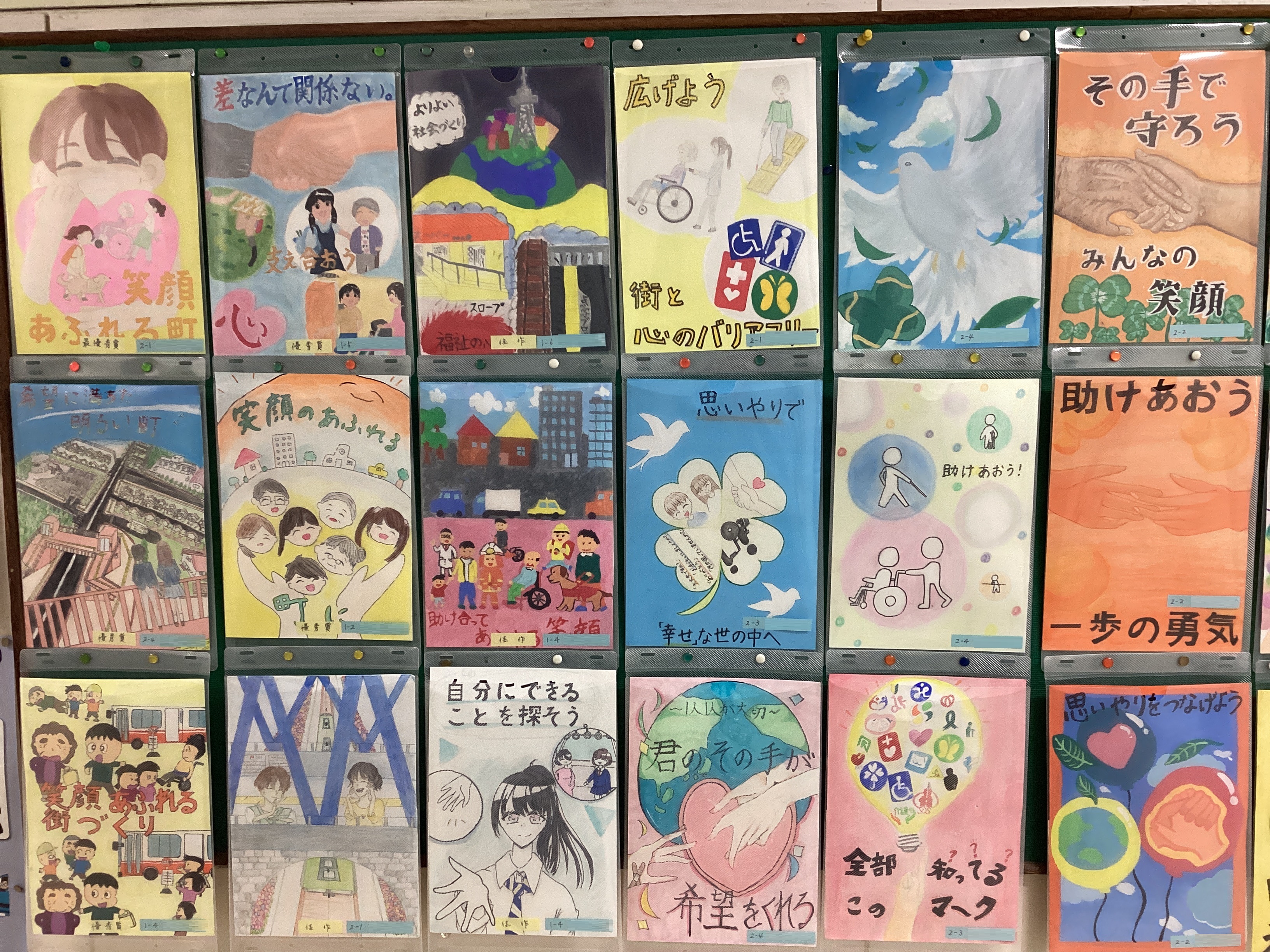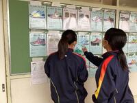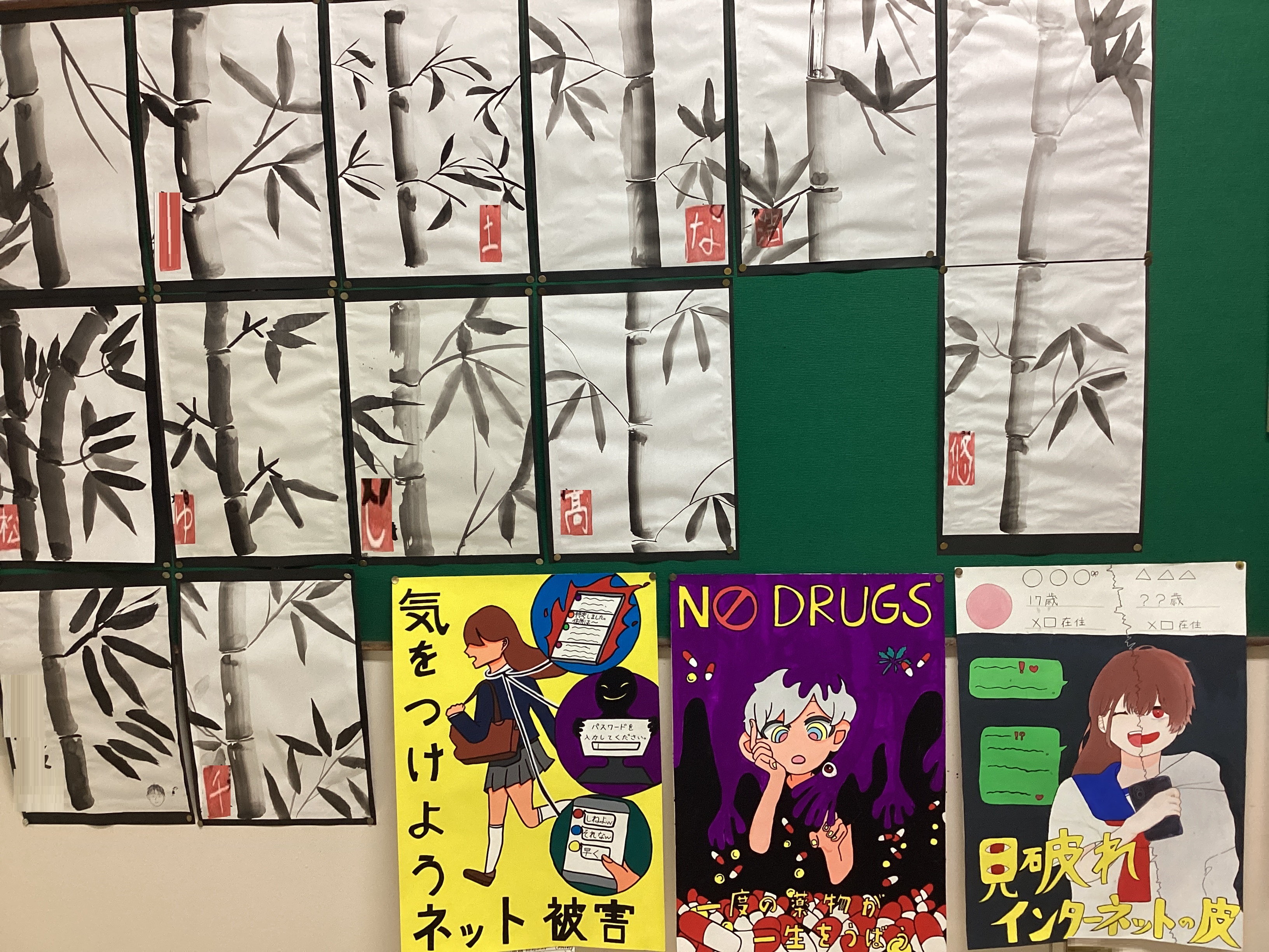 職員室前の廊下が、美術部や家庭科部の作った作品・生徒達が書いたポスター