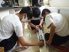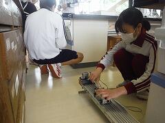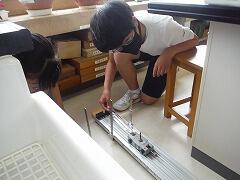 班ごとにわかれて、台車を使い坂道での運動の実験を行いました。