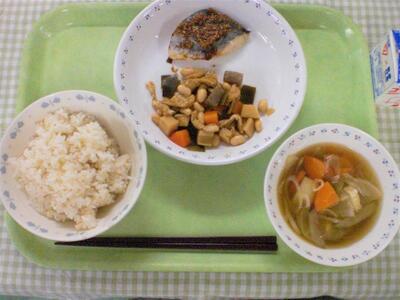 今日の献立は、和食です。主菜は、新メニューの鰆のごまみそ焼きです。その名のとおり、みそだけでなく、ごまが入ることで、風味もよりよくなっています。そもそも、鰆は、オランダ名では「サバの王様」と言われるように、実は鰆はサバの仲間です。そのため、栄養も似ていて、体を作るたんぱく質や記憶力アップのDHAなどが豊富に含まれています。ただ鯖より身が淡白なため、味のしっかりしたごまみそと相性がよいかと思います。また、ご飯とも合うので、一緒にもりもり食べてもらえたらと思います。