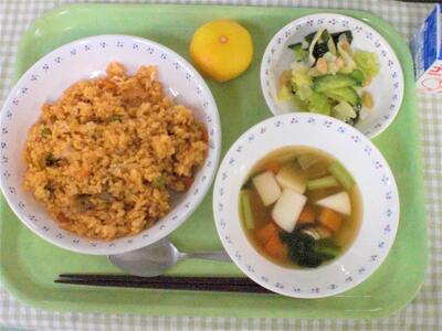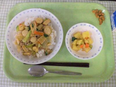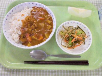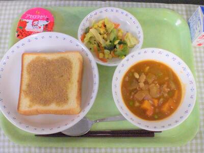 今日の献立は、洋食です。主食は、チキンカレーライスです。今日のカレーは、たんぱく質が豊富な鶏肉をたっぷり12キロ使い、他にも、じゃがいも、玉ねぎ、にんじんと具材がたっぷり入っていて、食べごたえのある美味しいカレーになっています。ぜひもりもり食べてもらえたらと思います。
