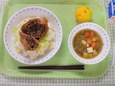 先ほどの献立名のとおり、今日は福島の料理を入れています。主食は、林間でも行く予定だった地域の会津のソースカツ丼です。一般的にカツ丼というと、トンカツを卵でとじたものをイメージすると思いますが、福島県の会津地域では違います。会津でカツ丼と言えば、トンカツにソースをかけたものが一般的です。そんな会津のソースカツ丼を、今日は、給食室手作りのトンカツソースをたっぷりかけたサクサクのカツと、会津のカツ丼に欠かせない千切りキャベツを添えて作りました。