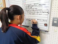 お昼に流す音楽はホワイトボードに記録されます。短期間に同じ曲を流さないようにするための、地道かつ丁寧な作業です。