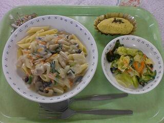 秋のクリームペンネ 投稿日時 : 2022/10/19 柏第三中学校 (今日の献立) 牛乳 秋のクリームペンネ 彩りサラダ 豆入りスイートポテト 小魚アーモンド *今日の献立は洋食です。 ペンネのソースはしめじをいれたクリームソースです。 きのこ類は、秋になるとたくさん出てくる食品で、今まさに旬な食材です。 スイートポテトには、いんげん豆のペーストを混ぜてあります。 苦手な豆を少しでも食べてもらいたいので、さつま芋に混ぜてデザートにしました。 {{options.likeCount}} {{options.likeCount}}