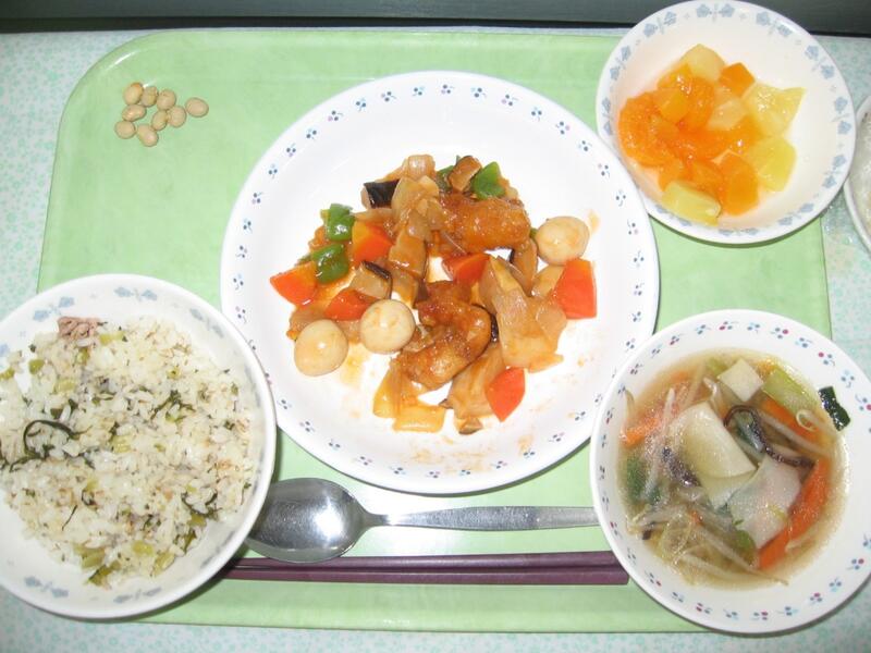 さて、今日の給食は中華です。主菜は、メルルーサの甘酢和えです。メルルーサは久しぶりに給食に登場します。メルルーサというとわかりにくいですが、よくスーパーのお惣菜で売っている白身魚、というのはほぼメルルーサです。南米やニュージーランドなどでとれる深海魚で、味はたらのような味をしています。今日は野菜たっぷり、具材たっぷりの甘酢和えで仕上げました。味的には酢豚に近いかと思います。