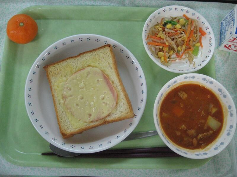 今日の献立は洋食です。主食はハムチーズトーストです。食パンにマヨネーズを塗り、ハム、チーズをのせて焼きました。シンプルなトーストですが、チーズがとけてパンがサクッと焼け、おいしく仕上がりました。簡単でおいしいので、ぜひご家庭でも作ってみてください。