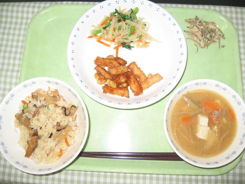 今日のかやく御飯には、にんじん、しいたけ、油揚げ、たけのこ、こんにゃく、ごぼう、グリーンピースとご飯をより美味しく食べられるように様々な具材が入ってます。具沢山で美味しく仕上がったので、ぜひしっかり食べてくれたらと思います。