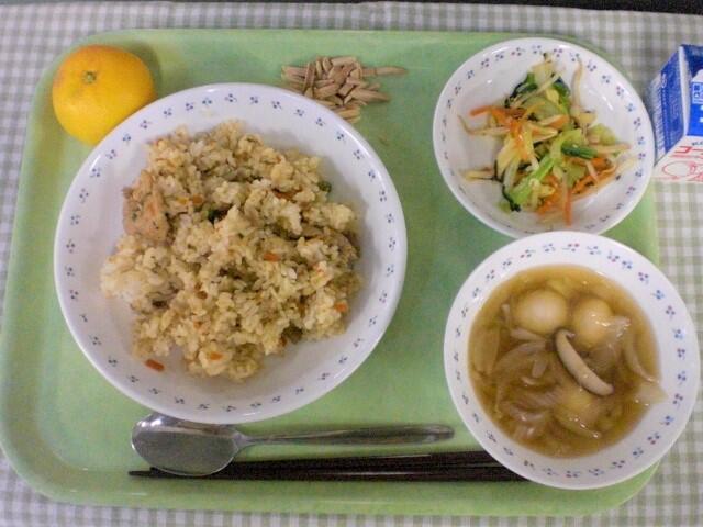 今日の献立は、中華です。主食は、五目炒飯です。「五目」という意味は、色々なものが入り混じっていること、という意味で使われています。今日の五目炒飯は、長ネギ、豚肉、にんじん、しいたけ、グリンピースが入っています。中でも長ネギは柏の特産物であり、今日のねぎも柏市布施産のものです。美味しくできたので、もりもり食べてくれたらと思います。