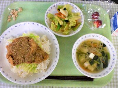 3年生の公立受験がいよいよ1週間を切りました。3年生は公立受験前ラストの給食です。そんな今日は、受験生応援献立にしました。主食は、自分に勝つ!勝負に勝つ!という応援の思いを込めた、みそ勝つ丼です。お肉屋さんの美味しいお肉に、小麦粉と水で作ったドロ、パン粉をつけて、サクッと揚げてくれました。そこへごまたっぷりの手作りのみそダレをかけて仕上げています。 給食室みんなで、思いを込めて作った給食なので、味わって食べてもらえたらうれしいです。