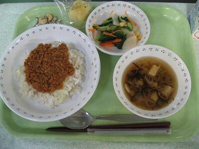 給食はタコライスを作りました。スパイスを入れて煮込んだタコミートは