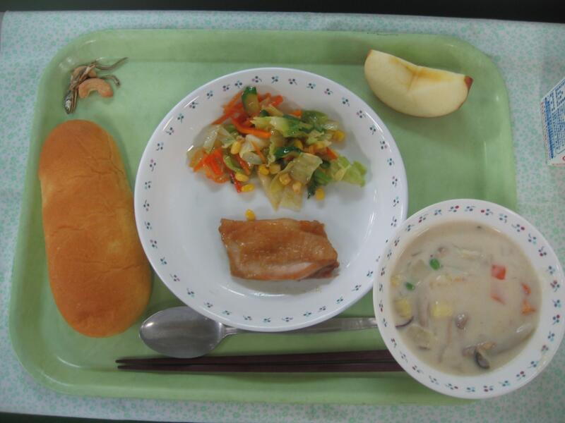 また、今日の汁物は秋味のクリームスープです。何が秋味なのかというと、旬なさつまいもとしめじが入っていることです。さつまいもにはビタミンCが多く、ストレスへの抵抗力を高めたり、風邪などから免疫力を高めたりという働きがあります。