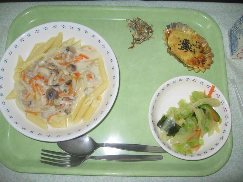 今日の献立は洋食です。主食は秋のクリームペンネです。普段のスパゲティはトマト系のミートソースですが、寒くなってくると食べたくなるのが濃厚なクリーム系です。ちなみに秋のクリームペンネの「秋」というのは、旬のしめじがたくさん入っているからです。トマト系よりもクリームソースはしめじが入っていても食べやすいので、きのこ類が苦手な人も1口でもいいのでチャレンジしてくれたらと思います。