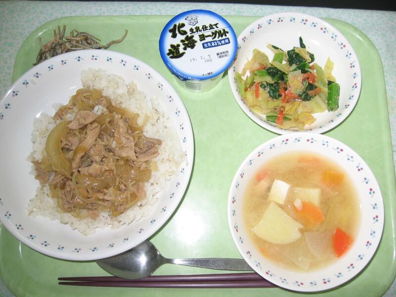 今日の献立の豚丼と石狩汁は北海道の郷土料理です。特に石狩汁は、その始まりは、明治初期です。石狩市のサケの地引網漁は有名でした。当時、漁師飯として味噌汁にサケのぶつ切りや、野菜を入れ、食べられていた「だいなべ」を、その観光客らに提供したことで料理として確立、「石狩鍋」と呼ばれ、その後定着しました。