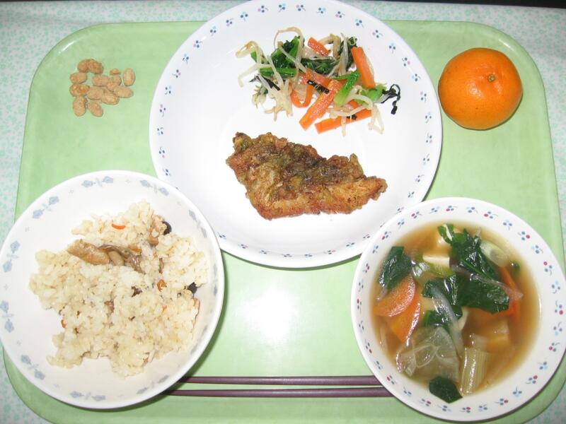 今日は秋田の郷土料理であるきりたんぽの汁物と、秋田の漁獲高5位と有名な鱈を使った磯辺揚げを献立に取り入れました。