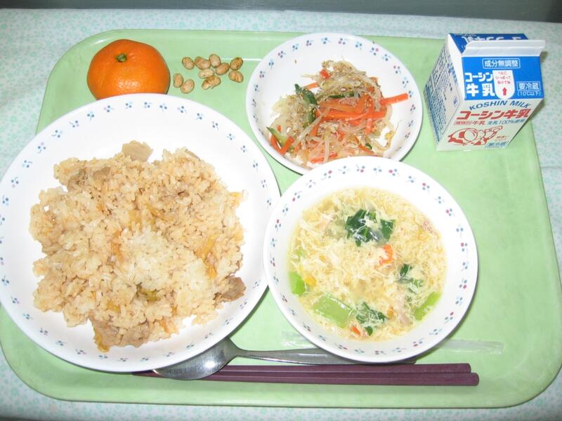 今日の主食は、キムタク炒飯です。リクエスト給食のアンケートをとると、上位にキムチ炒飯が入ってきます。そこにたくわんを入れるとキムタク炒飯になります。たくわんのポリポリした食感とその風味がキムチ炒飯と違ったおいしさになっています。お肉もたっぷり入っており、適度な辛味もあるので、食欲を誘う一品になっています。