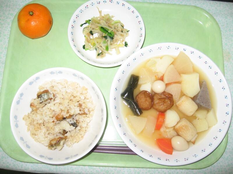 今日の主菜は、ほかほかのおでんです。今日のおでんには、じゃがいも、だいこん、人参、こんにゃく、昆布、豆竹輪、さつま揚げ、うずらの卵などのいろいろな具材が入っています。おでんは、野菜もとれ、卵や練り物もとれ、栄養的にもバランスがよいです。しっかり食べると栄養をとれ、体も温まります。ぜひ残さず食べましょう!