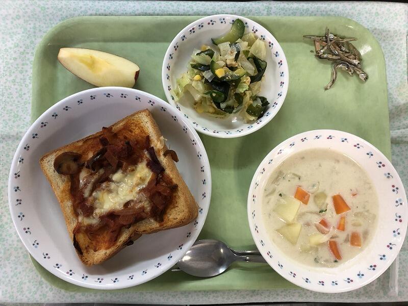 今日の献立は洋食です。主食はピザトーストです。ピザソースとケチャップをたっぷりぬって、野菜とベーコンをのせ、チーズをかけて焼き上げました。シンプルなガーリックトーストなどもおいしいですが、ピザトーストは具材も多いため、食べ応えがあるかと思います。