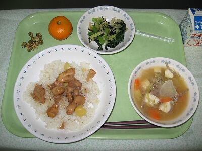 栗入り焼き鶏丼 投稿日時 : 2017/11/13 給食担当 牛乳栗入り焼き鶏丼磯香和え豚汁みかん抹茶大豆今日は2年1組旧3班が家庭科の授業でたててくれた献立です。秋の食材「栗」をご飯と炊き上げ、香ばしく焼き上げた鶏肉をご飯にのせていただきます。栄養を考えて具だくさんの豚汁です。とても美味しく大満足の献立でした。 {{options.likeCount}} {{options.likeCount}}