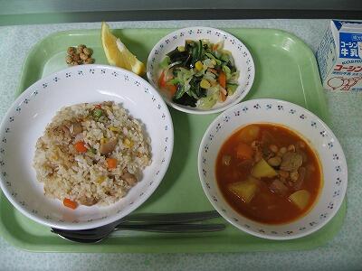 ツナピラフ 投稿日時 : 2017/06/12 給食担当 牛乳ツナピラフわかめとコーンのサラダポークビーンズ美生柑スパイシー大豆今日は洋食の献立です。主食はツナピラフを作りました。ご飯と具にバターの香りと旨みが染みこみ味わい深いピラフができました。副菜にはいんげん豆、大豆、グリンピースの3種類の豆をたくさん加えたポークビーンズです。トマト味なので豆が苦手な生徒も食べることができました。さあ、今週ももりもり食べて勉強に部活にがんばりましょう! {{options.likeCount}} {{options.likeCount}}