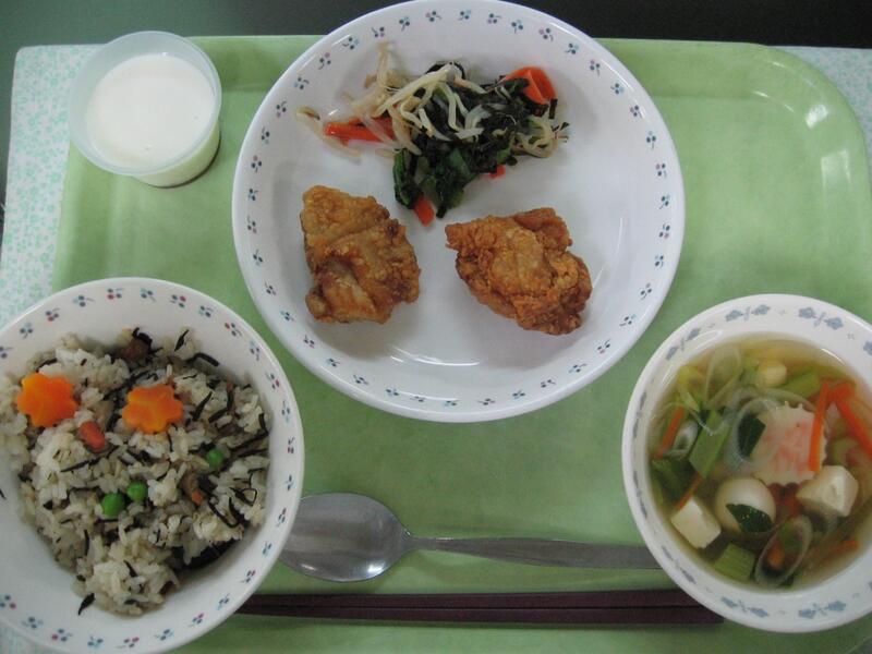 さて、今日の献立は和食です。副菜はひじきと大豆の炒り煮です。ひじきには、骨や歯をつくるカルシウムが多く含まれており、牛乳と同じ量を食べたときには牛乳より12倍ものカルシウムが含まれています。また、お腹の調子を整える食物繊維もたっぷり含まれています。