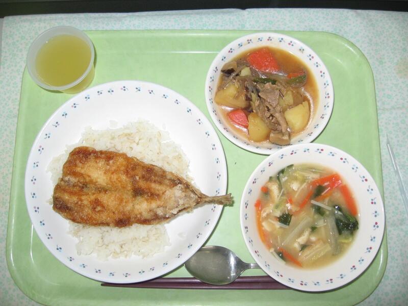 さて、今日の献立は和食です。主食はいわしの蒲焼き丼です。いわしは漢字で魚へんに弱いと書きますが、その由来は、生きているイワシを捕まえてもすぐに死んだり鮮度が落ちたりする弱い魚であることと一説にあります。いわしは、青魚であり、よく言っている脳の働きを活性化するDHA・EPAや、骨や歯を強くするカルシウムなどが含まれています。今日はしっかり揚げたので、骨まで食べられるかと思います。ごはんの量もあるので、いわしと合わせてしっかり食べてくださいね。