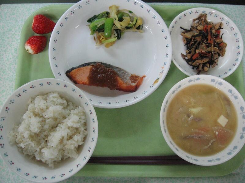 さて、今日の献立は和食です。副菜はひじきと大豆の炒り煮です。ひじきには、骨や歯をつくるカルシウムが多く含まれており、牛乳と同じ量を食べたときには牛乳より12倍ものカルシウムが含まれています。また、お腹の調子を整える食物繊維もたっぷり含まれています。