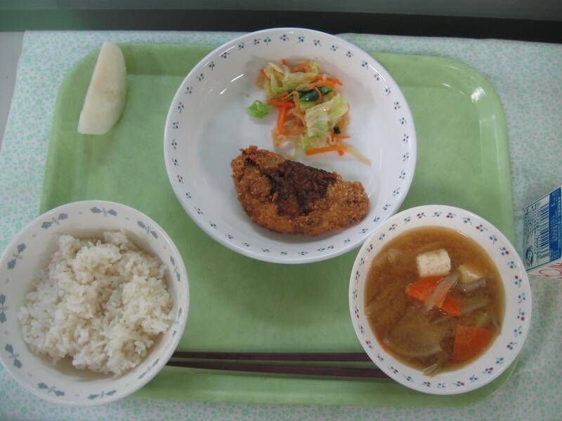 さて、今日の献立は和食です。主菜は鯵フライです。鯵には、骨や歯を丈夫にする働きのあるカルシウムが多く、魚の中でもトップクラスに含まれています。また、ビタミン類も多く含まれ、特にビタミンB2には細胞の成長を助ける働きがあります。他にもたんぱく質、脂質などがバランスよく含まれています。そのため、鯵は成長期の中学生にぴったりな魚です。